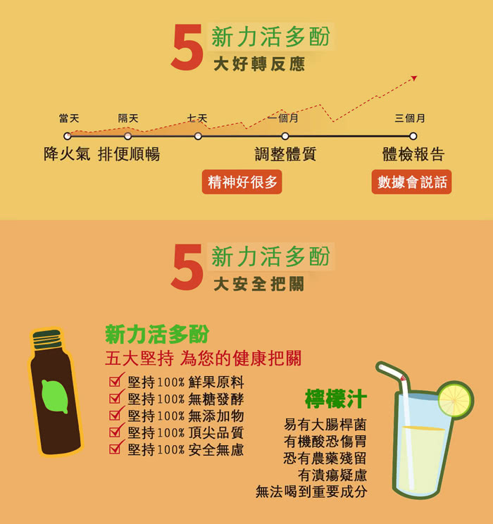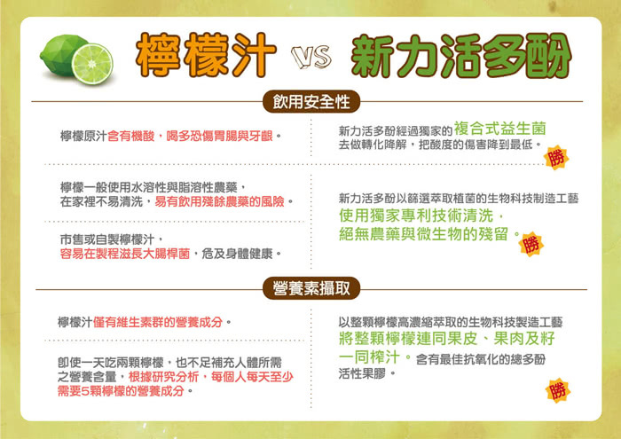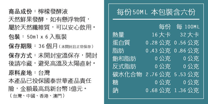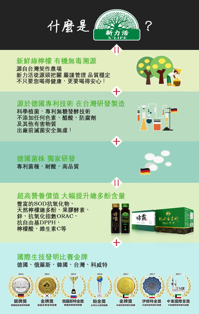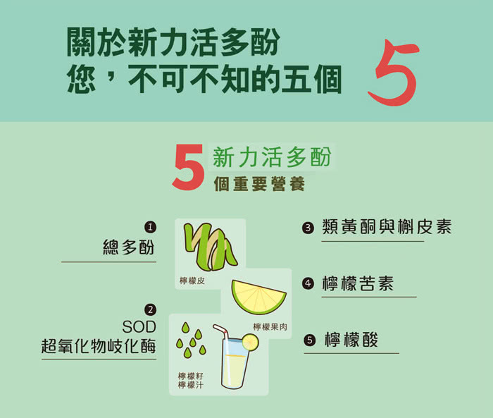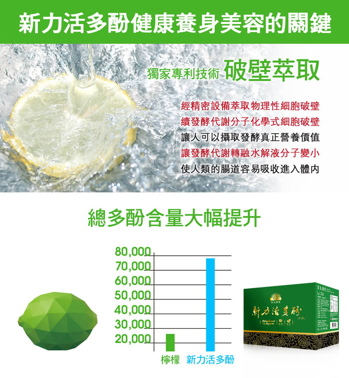 使用契作臺灣有機無毒的優質檸檬,將整顆檸檬裂解萃取後,滿滿植化素多酚來自100%檸檬含皮、獨家專利深層裂解,將檸檬最精華的營養成份做科學植菌發酵技術,保留檸檬精華營養素,過程中完全無添加任何添加物與防腐劑,富含檸檬苦素、檸檬黃素、植化素與生物類黃酮等具有良好的抗氧化活性,高劑量小分子化,促進新陳代謝,讓身體常保健康活力。